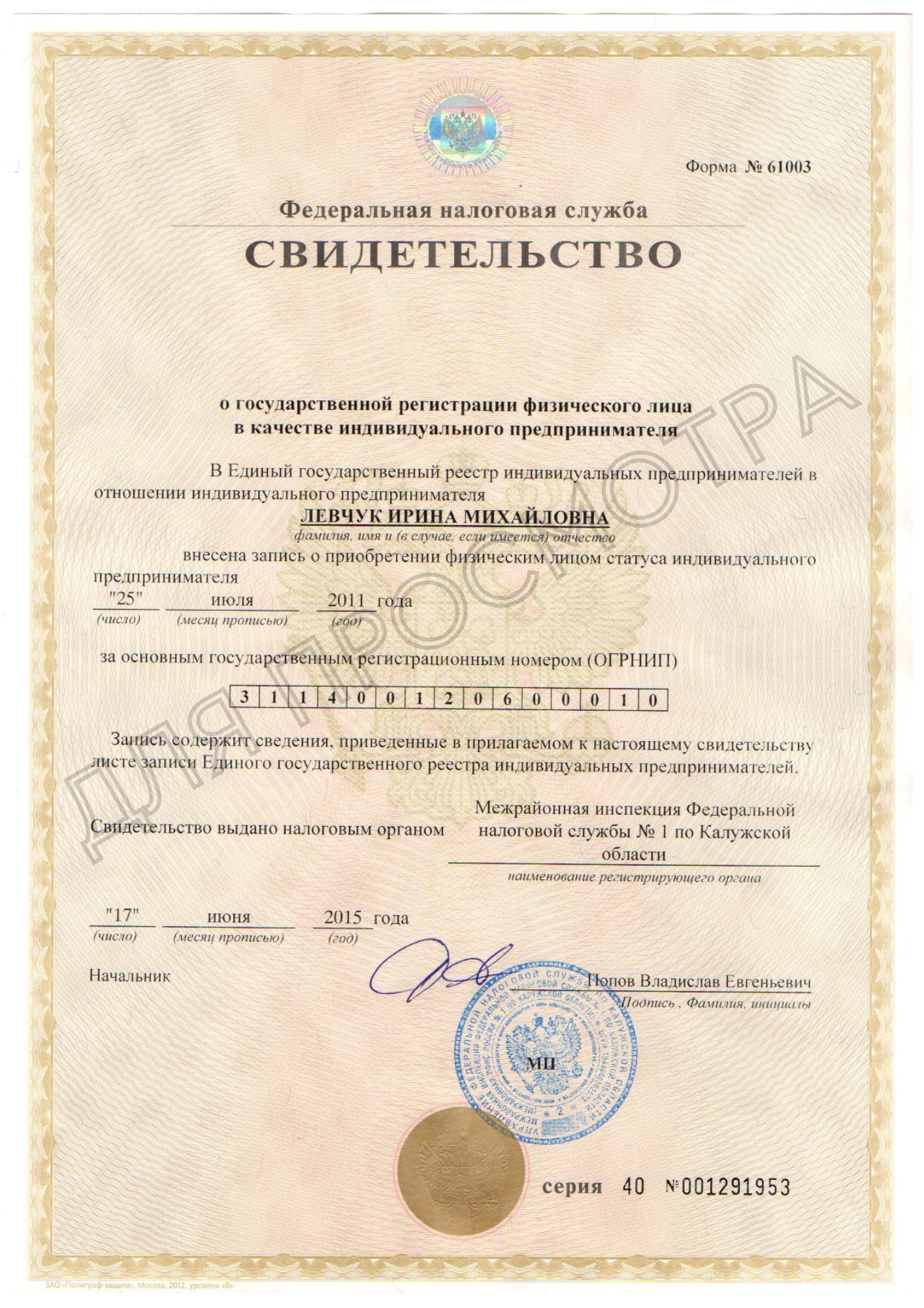 Индивидуальный предприниматель Левчук Ирина Михайловна |
